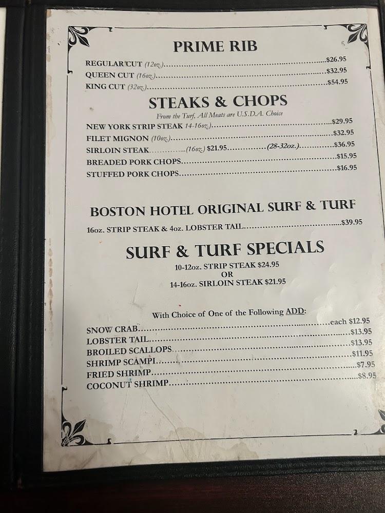 Boston Hotel's Steak & Crab features an extensive menu designed to please every palate. Seafood lovers will find dishes like Shrimp Scampi and Fresh Sea Scallops that continue to wow regular customers. The emphasis on local ingredients makes each seafood dish fresh and flavorful.